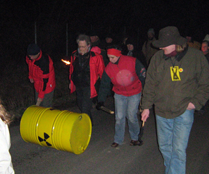 Gegen 19.00 Uhr fand ein Fackelzug zum Schacht statt, wo Udo Dettmann vom ASSE-II-Koordinationskreis, aber auch VertreterInnen und Exponenten aus anderen Organisationen und Einzelpersonen ihre Kritik an der geplanten Flutung des Atommülls äußerten. Für die Arbeitsgemeinschaft Schacht KONRAD e.V. brachte Ludwig Wasmus nicht nur solidarische Grüße und eine Spende für den ASSE-II-Rechtshilfefonds, sondern auch die Forderung, aus dem Debakel der ASSE II Konsequenzen für die Endlagerung insgesamt zu ziehen. An den Feuertonnen ging es dann weiter und während es ab 21.00 Uhr die ersten nach Hause ins Warme zog, kamen andere, wie KONRAD-Kläger Walter Traube aus Salzgitter, um ihren Beitrag zu leisten. Zwar blieb es während der Aktion trocken, doch war es wegen des heftigen und kalten Windes nicht möglich gewesen, Zelte zu errichten. Gleichwohl ließen es sich einige Anwohner nicht nehmen bis in die Morgenstunden vor Ort zu bleiben und damit ihre Wachsamkeit zu bekunden.