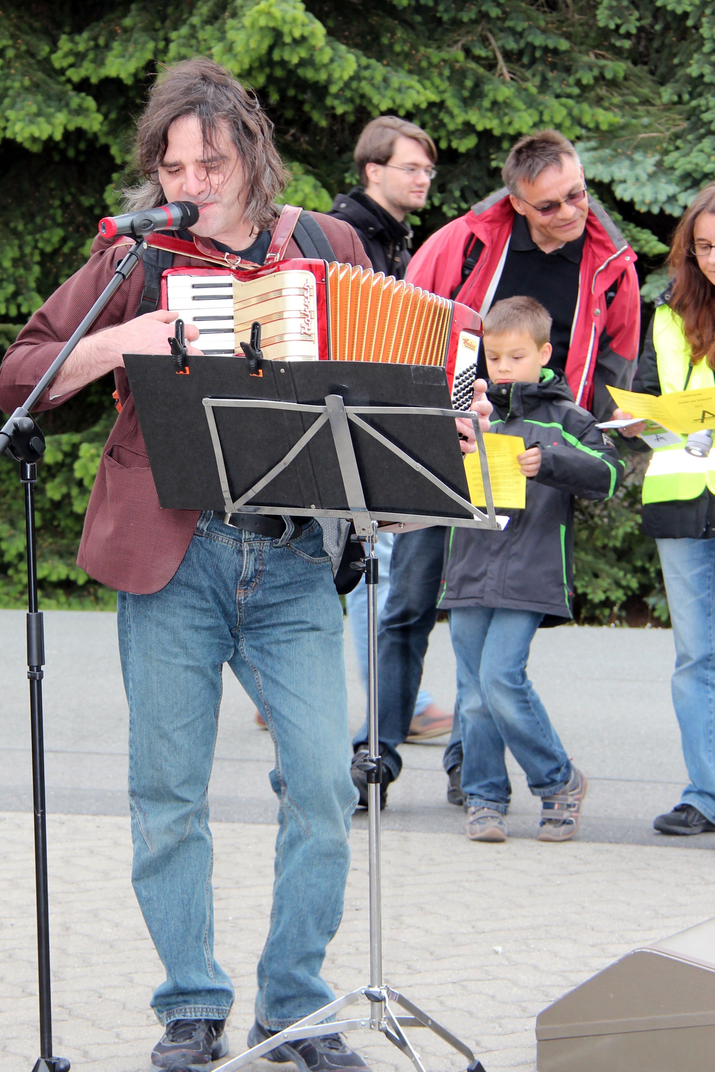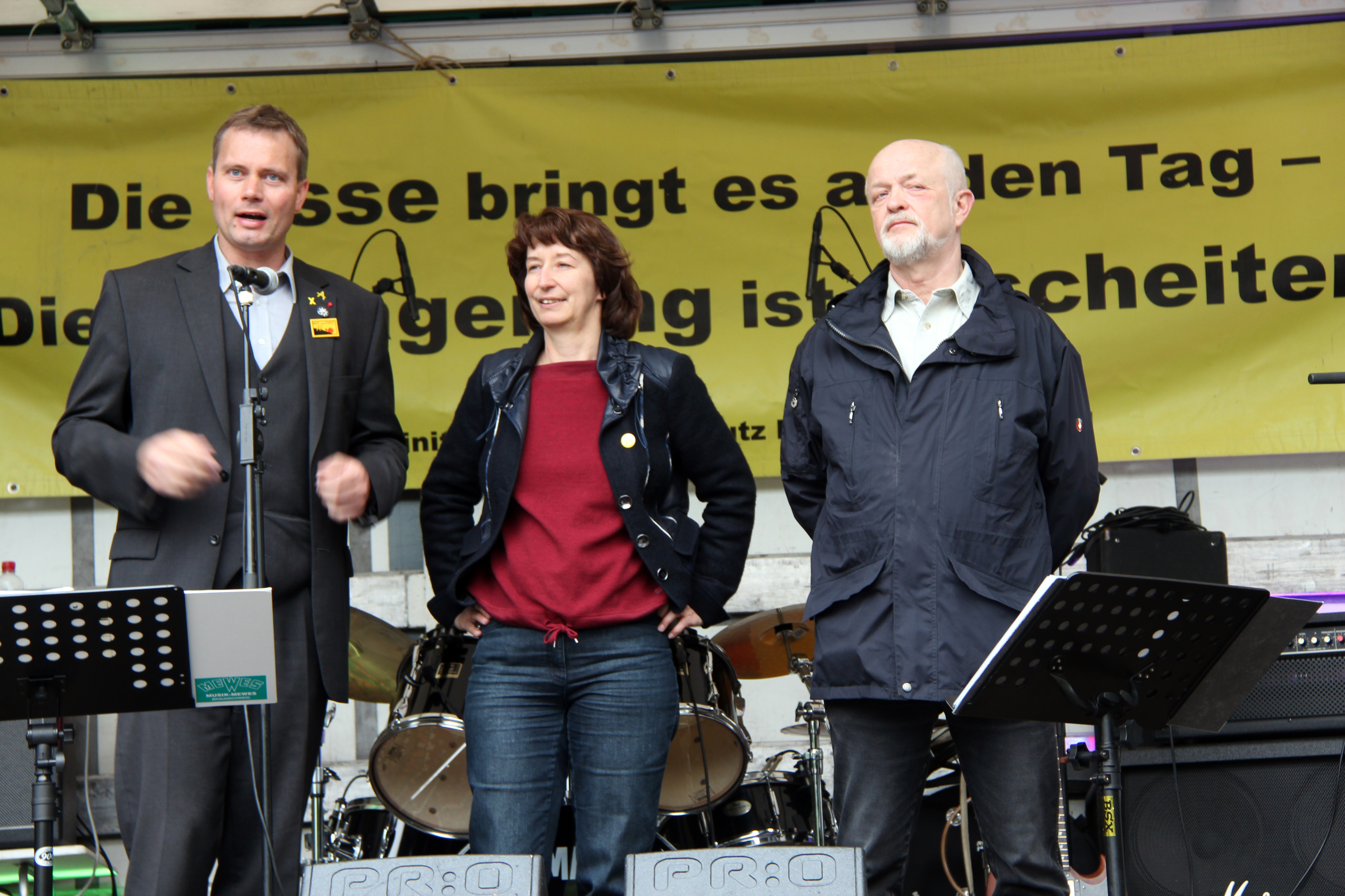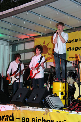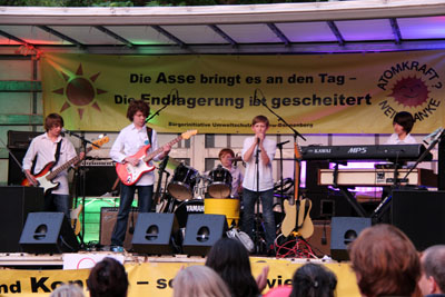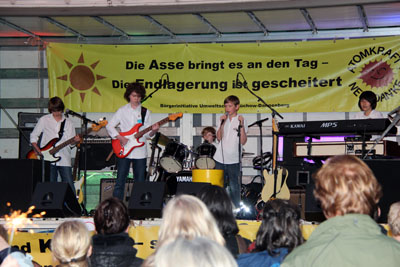 Auf dem großen Parkplatz an der Schachtanlage Asse II werden wir von drei Bands unterhalten:
