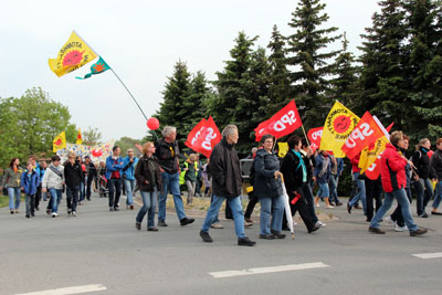 mal etwas enger, mal etwas "Luft" - der Demozug auf dem Weg zur Schacht-Anlage |